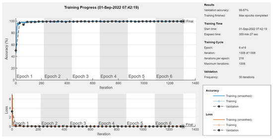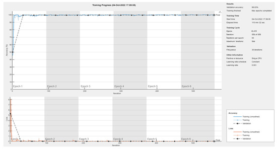 The results of this case are presented in Figure 5 and Figure 6. It can be seen from these results that, when the network is trained on identifying cracks in surfaces that are in outdoor settings, it works well, with 99.3% accuracy, but the performance of the same network in identifying cracks in underwater images is rather poor, close to 91.6% accuracy only. The poor accuracy is because the network is not trained with underwater images and it found it difficult to identify true cracks, resulting in false positives that reduced the accuracy of the method. The training progress plots, along with training parameters for the case with training, testing, and validation data = , are presented in Figure 7 and Figure 8 for SqueezeNet and AlexNet, respectively. Figure 7 and Figure 8 shows the network training performance. Figure 7 shows the training progress plot for SqueezeNet with training, testing, and validation using 30% of the data for each. Similarly, Figure 8 shows the training progress plot for AlexNet with training, testing, and validation using 30% of the data for each.