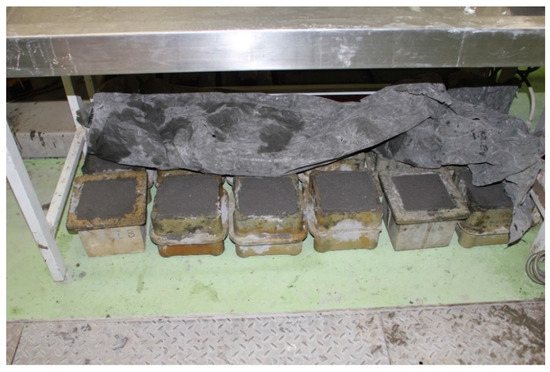 From the concrete mix prepared according to the above procedure, concrete specimens were then formed in the shape of cubes with a side length of 150 mm. The specimens were made in accordance with the EN 12390-2:2019 standard [74]. For this purpose, the concrete mix was laid in two layers. Each layer was compacted for a period of 30 s on the vibration table Controls C-161/LC at a frequency of 50 Hz (3000 vibrations/min). After compaction, the upper surface of the specimens was rubbed. Then, specimens were placed on the laboratory floor and covered with polyethylene foil. Successive care of the covered specimens was carried out by additional wetting every few hours. A view of the specimens during the early care process is shown in Figure 3. The black color of the cubes visible in Figure 3 is the result of the use of SF (Figure 2c) in the production of QBC series concretes.