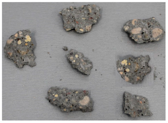 In order to trace the combined impact of FA, SF, and nS particles on changes in the ITZ structure and the size of microcracks at the contact of the coarse aggregate with the cement matrix in concretes based on quaternary blended cements, microstructural analysis was carried out. Experiments were performed after 28 days of curing of composites. The impact of the applied SCMS on the analyzed parameters was assessed using a scanning electron microscope (SEM). Samples for SEM analysis were taken from cubes damaged after strength tests, described in [66,72]. A view of several samples prepared for SEM tests is shown in Figure 4. Moreover, Table 5 contains relevant data related to the sample preparation process and the main assumptions used in the SEM tests.