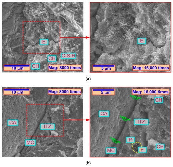 SEM microimages of analyzed REF concrete: (a) matrix area, (b) ITZ area; E—Ettringite, CH—Calcium Hydroxide, C-S-H—Calcium Silicate Hydrate, CA—Coarse aggregate, MC—Microcrack, P—Pore, ITZ–Interfacial Transition Zone.