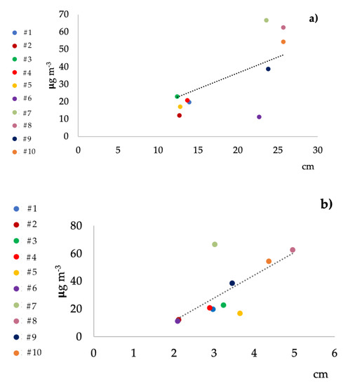 (a) Graph of the correlation between the length (cm) of the combustible part of the incense stick and the emitted concentration of benzene (μg m−3); (b) graph of the correlation between the diameter (cm) of the combustible part of the incense stick and the emitted concentration of benzene (μg m−3).