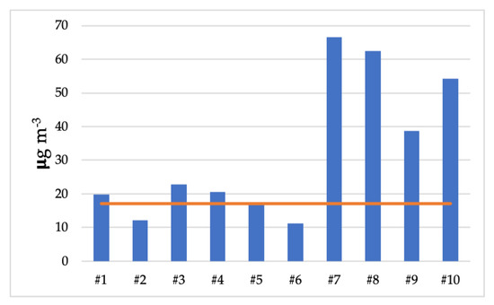 In Italy, as well, no specific regulation on residential indoor air quality is currently in force [25,26,27]. On the contrary, in Italy, levels of workplace exposure to carcinogens and mutagenic agents have been established in Legislative Decree No. 81/2008, which aims at the protection of health and safety at work. TLV-TWA, established by Legislative Decree No. 81/2008, is 3.25 µg m−3. However, Legislative Decree No. 81/2008 is not applicable to residential environments [28]. Furthermore, since 1938, the American Association of Industrial Hygienists (ACGIH) has focused on health in the workplace. Annually, the ACGIH publishes the Threshold Limit Value (TLV) for workplace exposure to benzene (1.6 mg m−3 for an 8-h exposure). The relative non-occupational indoor exposure is ((TLV-TWA)/10), namely, 1.6/10 is equal to 160 µg m−3. The values determined in the present study, using different varieties of incense, are 2.5 times lower (considering the upper extreme value of 66.5 µg m−3, recorded by stick #7 variety).