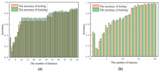 Additionally, then the GA-BLS model is set up in turn. For each round of feature increase, the training accuracy and test accuracy are saved, and the results are shown in Figure 6.