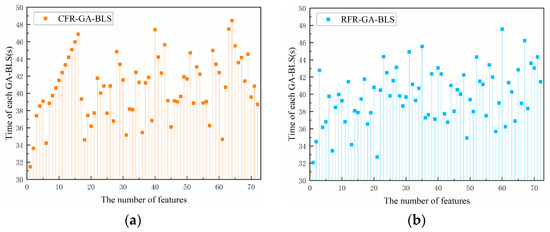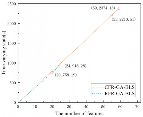To determine whether the features, parameters and accuracy found by RFR-GA-BLS perform well, the model state was manually changed to remove the jump-out condition and run 72 times. The features sorted by CFR and RFR were sequentially imported into GA-BLS, and the change in accuracy was observed for each round, and the results are shown in Figure 9. The running time of each round of GA-BLS was exported, and the results are shown in Figure 10.
