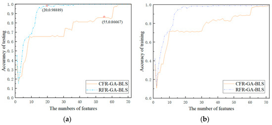 According to Figure 9, it can be concluded that the CFR-GA-BLS model satisfies the end condition at the first 55 features, but its accuracy does not reach the optimal value. After the number of features is 65, the accuracy rate jumps. In the case of RFR-GA-BLS, the condition is satisfied at the number of features 20. Although 25 features can reach 1, 20 features make its operation time shorter, and the smaller accuracy gap can be ignored. Therefore, RFR-GA-BLS can achieve more efficient and accurate fault diagnosis.