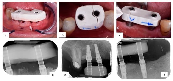 (a) Gypsum check screwed on abutments showed no fracture; (b,c) gypsum check fractured when screwed on abutments; (d–f) intraoral rx showed correct coupling between implant and abutments.