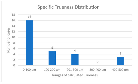 Specific Trueness values distribution: the 57% of digital impressions were within 100 µm.