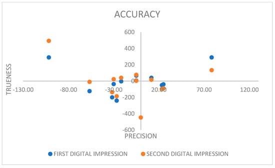 Scatter plot of Accuracy comparison between the first and the second digital impression.