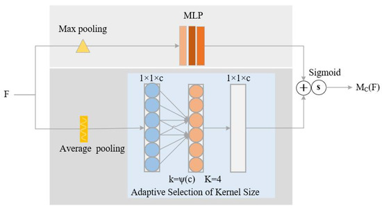 The Convolutional Block Attention Module (CBAM) [28] is a hybrid attention mechanism. It consists of a channel attention module and a spatial attention module. The channel attention module is shown in Figure 2. According to the figure, it first performs global maximum pooling and global average pooling separately on an input feature map-F to generate two 1 × 1 × C feature maps. And then, it exploits multilayer perceptron (MLP) to process these two feature maps. After fusing the output of MLP, it generates a channel attention- which is calculated according to Equation (1). In the equation, depicts the sigmoid function, and and denote the feature maps generated by average pooling operations and max pooling operations, respectively. and are the MLP weights.