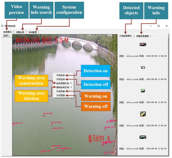 PFWD can process multiple videos simultaneously in real-time depending on the multi-threading technique. It utilizes tab widget as the container to preview multiple videos and display the detected and classified results. A tab in the tab widget is used to display the video data from a camera or a video file and the corresponding detected results. Each tab is set up with a pop-up menu that provides options such as detection on and off, warning on and off, etc. To enable the warning function, at least one warning area should be drawn beforehand. As soon as the floating objects in the warning areas exceed a predefined threshold, an immediate warning message is issued. Figure 11 shows interface PFWD.