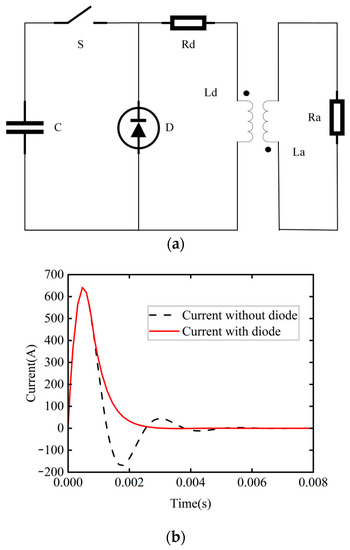 External circuit and current waveform. (a) Schematic diagram of external circuit; (b) Current waveform before and after adding freewheeling circuit.