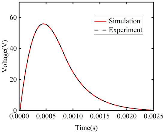 First, we must verify the accuracy of the external circuit simulation. We connect a 0.1 Ω resistor in series with the external circuit, charge the capacitor fully, use a switch to trigger the capacitor to discharge, and measure the voltage on the resistor. A comparison between the results of the simulation and the experiment is shown in Figure 5. Then, we apply ANOVA to compare the results. The analysis of variance result for the simulated data is 3.8561, while the analysis of variance result for the experimental data is 4.0255. This demonstrates that our external circuit simulation is valid.
