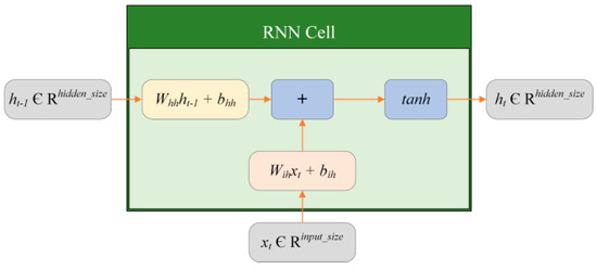 The network structure of an RNN is shown in Figure 7. It can be seen from the figure that an RNN is essentially a fully connected neural network, in which the role of the embedding layer is to convert the input into a low-dimensional and dense vector, and the role of the linear layer is to convert the output dimension of the hidden layer into the required output dimension. However, the difference is that an RNN splices multiple fully connected neural networks together. The activation value of the current RNN Cell is calculated from the current input and the activation value of the previous RNN Cell, so the RNN can remember each moment’s information. The structure of an RNN Cell is shown in Figure 8.