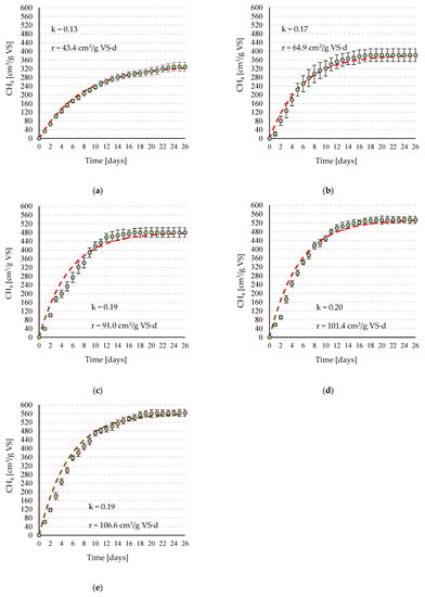 Kinetics of methane production depending on experimental variant: (a) V1; (b) V2; (c) V3; (d) V4; and (e) V5.