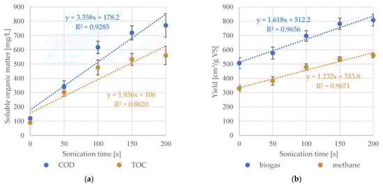 Correlation analysis: (a) concentrations of organic compounds in the dissolved phase depending on sonication time; and (b) biogas and methane production yield depending on sonication time.