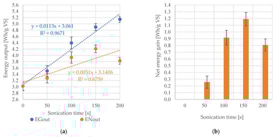 An energy gain assessment of the anaerobic digestion of the M–BGS pretreated with ultrasound showed that the highest net energy output of 4.21 ± 0.17 Wh/g VS was obtained with 150 s of sonication. Similarly, the estimation of the net energy gain indicated this variant of the experiment as the most effective. The data analysis confirmed the existence of strong correlations between the UP time, amount of biogas and methane production, and gross energy gain.