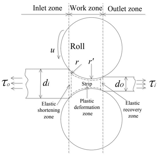 The cold rolling process includes the inlet, working, and exit zones. The working zone is the deformation area of the rolled piece. The deformation zone consists of three elastic zones: the outlet elastic zone, the inlet elastic zone, and the plastic-elastic zone. There is a strong load phenomenon at the working boundary between the roll and the strip, which results in a certain elastic deformation of the roll at the local position. Therefore, the roll-flattening radius must be considered when analyzing the rolling force model [19]. The Bland-Ford model theory is used to develop the rolling force model of cold rolling, which considers plastic deformation, elastic deformation, and unstable disturbance of the roll-flattening radius.