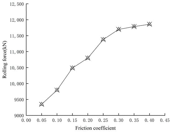 The intermediate pass plays a crucial role in the stability of cold tandem rolling [22]. In this study, the focus is on intermediate passes. The relationship between the friction coefficient and the rolling force is depicted in Figure 4. It can be observed that the rolling force increases with an increase in the friction coefficient. However, beyond a friction coefficient of 0.2, the rate of increase in rolling force tends to decrease. While a smaller friction coefficient leads to energy savings, it also results in poor rolled surface quality due to the fluid dynamic state at the working interface of the roll and the rolled piece, as well as the lack of constraints on grain deformation on the rolled surface. Therefore, designing lubrication technologies is an effective approach to reducing the rolling force, saving energy, and improving strip production quality.