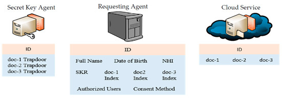 The Secret Key Agent (SKA) resides on a server that stores the required information for decrypting information stored in the cloud. As explained earlier, for every patient, there are three secret keys (Sk) listed under a secret root key (SkR) which are used to decrypt three documents. All secret keys are stored together with trapdoors for all documents related to one patient (under one SkR). The main functionality of the SKA is to receive requests from the RA and send the required trapdoors directly to the user. SKA has a one-way communication channel with the RA, which is to receive requests, and a one-way communication channel with users to send secret keys, encrypted indexes, and trapdoors.
