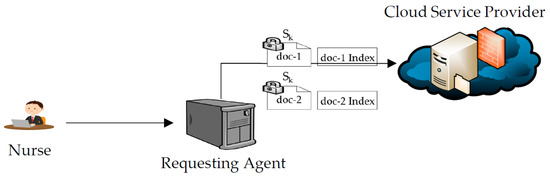 Searchable symmetric encryption is a cornerstone of the proposed system architecture. The main objective of the proposed system architecture is to store patients’ information on the cloud without allowing the cloud provider to read it. Achieving this is considered easy but not practical without a mechanism that enables searching through encrypted information without decrypting it. The proposed system employs a searchable symmetric encryption (SSE) approach. The SSE approach enables outsourcing data storage while preserving the ability to selectively search over it. There are three models for searching on encrypted data identified in the literature: searching on public-key encrypted data [60], single-database private information retrieval (PIR) [61], and finally searching on private-key encrypted data [59] which is the approach employed in the proposed cloud architecture. For consistency purposes, the private key is denoted by secret key (Sk) throughout the paper. In the secret-key-encrypted data model, the data are encrypted by the user and are organized in an arbitrary way prior to encrypting it. The data are stored on a server in encrypted form, and decrypting it can only happen with the Sk. In this model, the initial work for the user is large when the data are large, while subsequent work, such as accessing the data are small. The user’s work is large because data pre-processing requires performing a number of processes to facilitate searchability while it is encrypted. Structuring data as part of the pre-processing allows for efficient access to relevant data. In this proposed system, information is partitioned into portions denoted by documents, as explained earlier. For every patient, there is a root secret key (SkR) that is used to encrypt three secret keys (Sk). Secret keys are used to encrypt patients’ documents (doc-1, doc-2, and doc-3). Each document is encrypted with its corresponding Sk. Indexes and trapdoors—explained further in this section—are generated to identify and decrypt documents, respectively. An important property of the secret-key-encryption approach is that anyone who can decrypt information for a document can also decrypt any file in that document. This means anyone who has access to a document can have access to all files within that document.