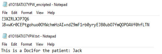Categorizing information is one of the UA’s functionalities. The application organizes patient information files into three documents (doc-1, doc-2, and doc-3) before they are stored on the cloud. The UA has a standard user interface for all users. Information is accessible when it appears in predetermined fields on the user interface. Information is presented in its associated fields only when it is decrypted. Information fields remain blank when their corresponding files are not decrypted. For example, if a field on the application interface is predetermined for information related to patient mental health, this field remains blank when the logged-in user is not authorized to access the document in which the mental health file exists.