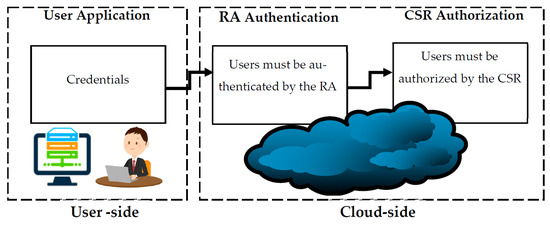 The first station is on the user side, which involves entering the user’s credentials to access the system. Users’ credentials in the real implementation can be through information entered by the system (user ID and password) or other forms of credentials such as figure prints. The second station is on the cloud side, which involves authenticating the user. The user must be authenticated by the RA component before the authorization process takes place. The third station involves the authorization process. Once a user is authenticated by the RA, the authorization process happens through the CSR. The CSR is not accessible by the user; it only communicates with the RA component.