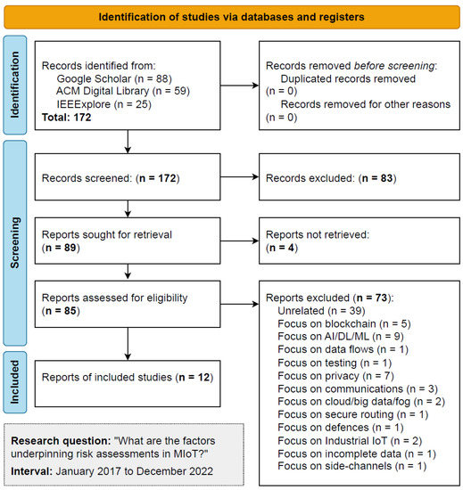 Regarding the process, the initial identification resulted in 172 records, with four removed for being duplicates or unavailable. The next phase screened these records and excluded 83 because the title or abstract was unrelated to our SLR proposition. We assessed 85 reports, reading all the work and excluding 73 for various reasons related to not meeting the previously identified eligibility criteria. The process finished with selecting 12 studies, where we extracted significant risk-associated elements, frameworks, standards, attacks, and methodologies to support our discussion. Table 1 summarises the main findings from the SLR, presenting an overview of selected work on RA/DRA. Note that some literature is specific to MIoT, and some discusses IoT in broader terms.