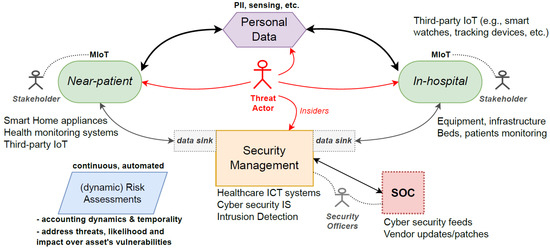 In the healthcare domain, devices must adhere to additional constraints to ensure the safety and security of stakeholders. They must be compliant with other specifications and not interfere with underlying technologies. These devices are equipment referred to as Medical Internet-of-Things (MIoT), a subclass of IoT. MIoT sits within a broader cyber-physical system (CPS) [4] adding remote management capabilities over distributed assets [5,6,7,8]. Modern infrastructure design has incorporated MIoT into healthcare settings [9], especially after the COVID-19 pandemic [10]. Employing IoT in the patient’s environment is highly advantageous; this typically involves IoT sensors monitoring patients and promptly transmitting data to sinks or servers for analysis. Solutions vary and examples include health prescription assistants (HPA), healthcare status monitoring (heartbeat, temperature, CO levels, sensing features), tracking patients’ movements, and detecting whether someone has fallen. Since its inception, security has been a key concern [11,12,13] and significant research has sought to address the security challenges and develop and deploy hardened solutions. All these inter-connected devices extend the feature set available to end-users; however, this comes with trade-offs between privacy and cyber security objectives. Despite having to comply with regulations by vendors, they must be sufficiently equipped with mechanisms to cope with accidental and deliberate malfunctions. These failures could be caused by flawed designs, poor testing, or active cyber-attacks aiming to exfiltrate personal and identifiable information (PII) [14] from stakeholders. Governments and organisations are enforcing legislation to protect users and patients, for instance, the Health Insurance Portability and Accountability Act (HIPAA), in the US, and the General Data Protection Regulation (GDPR), in the UK and European Union (EU). These efforts signal the need to safeguard and protect data with clear repercussions for violations; this further highlights the importance of secure MIoT systems.