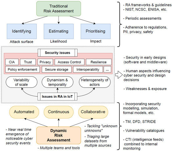 While RA is a proven method in identifying and mitigating security risks, it is traditionally only performed periodically. In highly dynamic systems, the important factor is change. This is especially true of IoT, where the system or the environment may change (changing the attack surface). For example, new sensors can be deployed, or devices may switch to a new network. Furthermore, new attacks will emerge. Periodic RA is unable to respond to these changes and ensure risk is managed in a timely fashion. Zio (2018) [21] has discussed the future of RA, establishing the most relevant aspects to incorporate dynamic elements directly into the analysis. This RA variant called dynamic risk assessment (DRA) targets continuous, near real-time, on-the-fly reassessments. Applying DRA in IoT is not new, as it has been addressed in many discussions [22,23] and case studies for threat-based RA in smart homes [24,25,26,27]. These studies highlight that DRA provides better observability (this term comes from control theory and distributed systems [28]; it is used nowadays as a means to understand a system’s states by inspecting the data it generates in event logs, metrics, etc. to append protective features) features to systems when tackling unknowns situations [29], i.e., events that “we do not know we do not know” [30].