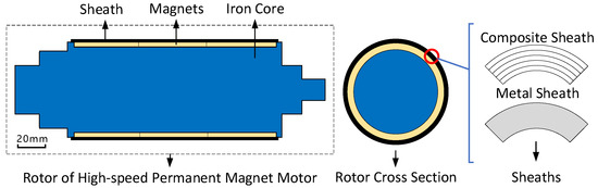 High-speed permanent magnet motors have a promising future. It is small, has a high power density, and can be directly connected to high-speed loads [1,2]. The rotor structure is shown in Figure 1, and the mechanical strength of the magnets is poor, so additional sleeve protection is required. Two kinds of sleeves are commonly used, namely metal sleeves and composite sleeves. Among them, carbon fiber composite protective sleeves have the following advantages: they have weak conductivity, which reduces eddy current losses in the sleeve [3]; they also have low density, which increases motor power density; additionally, they have higher strength and require less thickness than other materials, maximizing the actual air gap of the motor and creating possibilities for electromagnetic coil design [4].