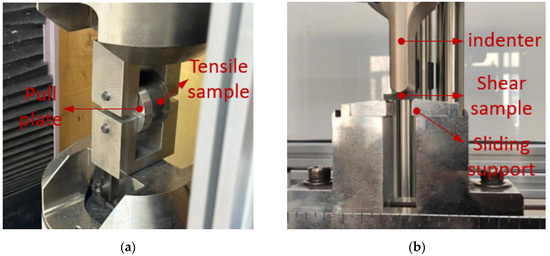To prepare tensile-shear specimens, the following steps were taken: firstly, a release agent was applied to the winding mold, and the pipe was wrapped to its full length and full wall thickness; then, it was cured in the curing furnace and demolded; finally, the wet-wound pipe was cut according to size, manually polished, and numbered. Because there is a large dispersion in the preparation process of NOL ring winding, nine horizontal tests were selected for tensile and shear tests. Twenty-one groups of tests mentioned in the article required a total of 252 NOL rings to prepare tensile-shear specimens. Tensile tests were performed on a universal testing machine at a loading speed of 2 mm/min, while shear tests were performed at a loading speed of 1 mm/min. The test temperature was 23 °C and the humidity was 55%. The tensile-shear test is shown in Figure 3.
