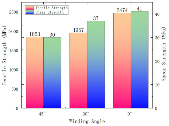 The tensile failure results of NOL rings with different winding angles are plotted in Figure 4. The relationship between tensile strength and shear strength is as follows: