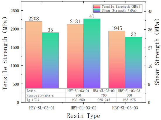 The NOL ring failure data of different resin types were sorted in Figure 7. From the tensile strengths and interlaminar shear strengths of the three levels, it is known that the breaking strengths of NOL rings prepared with HBY-SL-03-01 resin and HBY-SL-03-02 resin are higher than those of NOL rings prepared with HBY-SL-03-03 resin. It was found that the viscosity of HBY-SL-03-01 and HBY-SL-03-02 resins was the same, both higher than that of HBY-SL-03-03 resin. It is known that resin viscosity is one of the factors affecting the mechanical properties of NOL rings. The resin with higher viscosity is easier to wrap on the surface of carbon fiber, which can more effectively protect the carbon fiber during the process, reduce fiber wear, and improve the quality of the composite. In addition, as the viscosity of the resin increases, the crosslink density between the resin molecules increases, which also leads to a decrease in the tensile strength of the composite [27].