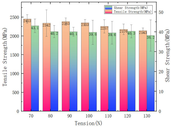 For wet winding, failure data of NOL rings with different winding tensions are sorted in Figure 8. When the winding tension varies between 70 and 130 N, the failure load of composite materials decreases as the winding tension increases. The NOL ring with a winding tension of 70 N has the highest tensile strength and shear strength, which are 2453 and 43 MPa, respectively, and the NOL ring with a winding tension of 130 N has the lowest tensile strength and shear strength, which are 2143 and 38 MPa, respectively.