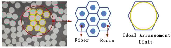 Figure 10 shows the microstructure of composite materials and the schematic diagram of resin-rich regions arranged in hexagons. It is shown that the volume content of the ultimate fibers inside the composite can reach 90.7%. However, it is impossible for carbon fibers to reach the ideal arrangement limit in the resin matrix in engineering, and there must be resin-rich areas in the composite materials. Generally, the fiber volume content ranges from 60 to 80%. Therefore, 0.8 is taken as the ultimate fiber volume content in this paper, and k is taken as −0.25 after correction with the actual measurement results. The comparison in Figure 8 shows that the predicted fiber volume content of composite materials is in good agreement with the actual measured results.