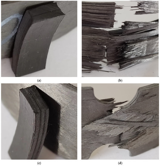 Macromorphology of NOL ring sample before and after damage. (a) Circumferentially wound NOL ring shear failure; (b) circumferentially wound NOL ring tensile failure; (c) 45 ° wound NOL ring shear failure; and (d) 45 ° wound NOL ring tensile failure.