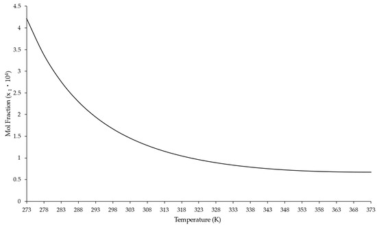 The analysis provides a clear view of the relationship between temperature and the molar fraction of radon. The molar fraction of radon is a measure of its solubility, and upon analyzing the data, a distinct trend is observed: whereas the temperature increases, the molar fraction—and thus the solubility of radon—decreases. At the beginning of the line, at a temperature of 273.15 K, the molar fraction of radon is 4.217. This value consistently decreases as the temperature rises. At 373.15 K, the molar fraction of radon is only 0.672, significantly lower than the initial value. This negative trend indicates that radon is less soluble in water at higher temperatures. The decrease in radon solubility with increasing temperature may be due to the fact that, with increasing thermal energy, radon molecules have more energy to escape from the solution and enter the gas phase. This pattern is quite common for gases in solution and suggests that, under warmer conditions, it can be expected that there is less radon dissolved in water and more present in the gas phase.