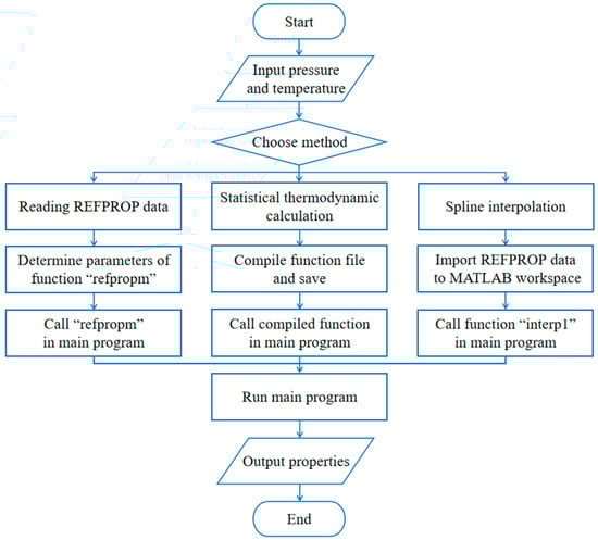 Spline interpolation is also employed for determining hydrogen properties. The process of spline interpolation is divided into two steps: (1) acquiring property data from REFPROP in 1 K increments and importing them to the MATLAB workspace before the program runs; (2) calling the function “interp1” in the main program to accomplish spline interpolation, and choosing the fourth parameter of “interp1” as the “spline”. The procedures for determining hydrogen properties using the aforementioned three methods are shown in Figure 1.