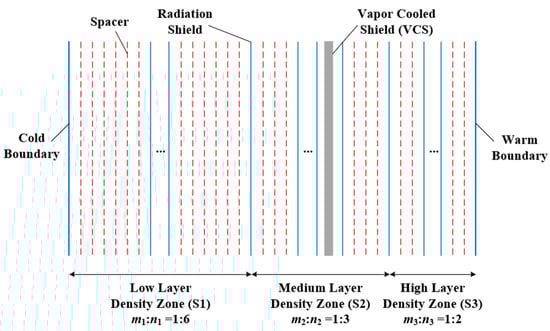 Variable density multilayer insulation (VDMLI) presents a better thermal insulation performance in comparison to the conventional MLI under the same total weight. The physical properties of the VDMLI are presented in Table 1. The configuration of the VDMLI is schemed in Figure 3. VDMLI is normally divided into three zones with the same thickness, the same spacer number, different layer densities and different radiation shield numbers. The numbers of radiation shields and spacers are denoted by m and n, respectively. All configuration parameters of the low-density zone, medium-density zone and high-density zone are marked with subscripts 1, 2 and 3, respectively. The configuration parameters of the VDMLI are listed in Table 2, being exactly the same as those of 5#(VD) in Wang’s study []. The VCS optimal position is at the midpoint of the VDMLI, as reported in Jiang’s study [].
