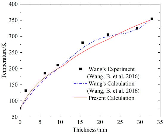 The LBL model is verified to calculate the thermal resistances of the inner and outer MLI. The temperature profile is consistent with Wang’s [] experiment and calculation, as shown in Figure 4. Moreover, the calculated temperature is closer to the experimental data in the low-layer-density zone. The analytical model for the VCS-MLI structure is then validated. A 40 mm thick foam is added between the tank and the cold boundary in accordance with the insulation structure that Jiang [] studied. Figure 5 shows that the temperature distributions agree well with Jiang’s results []. The maximum deviations are not more than 6% whether or not the VCS is applied. The analytical model for the VCS-MLI is applicable to subsequent analysis.