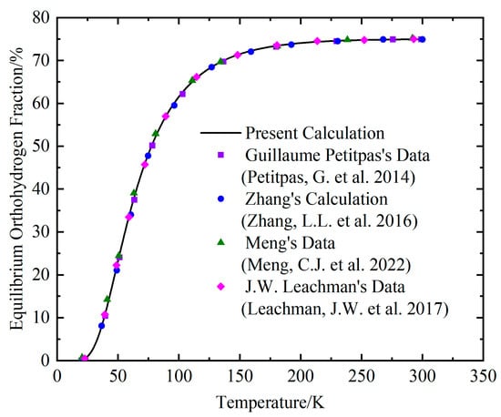 The ortho-H2 fraction in equilibrium H2 is calculated. As shown in Figure 6, the present calculation agrees well with the data from four scholars [,,,]. When the temperature exceeds 198 K, the composition of equilibrium H2 is approximately 75% ortho-H2 and 25% para-H2. When the temperature approaches the normal boiling point of liquid hydrogen, almost all of the hydrogen molecules are likely to transfer to the lowest energy level (j = 0) []. As para-H2 molecules are restricted to even rotational energy levels, 99.8% para-H2 and 0.2% ortho-H2 comprise equilibrium H2.
