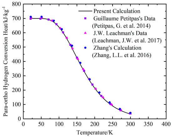 Figure 7 shows the calculated para-ortho H2 conversion heat. The present calculation is in accordance with the data reported by three scholars [,,]. At low temperatures, para-H2 molecules tend to be at the most stable energy level (j = 0), so almost all ortho-H2 molecules are converted to the lowest energy level and extensive energy is released. The para-ortho H2 conversion heat is maintained above 690 kJ·kg−1 if the temperature is less than 73 K. As the temperature rises, some para-H2 molecules jump to higher energy levels. Therefore, not all ortho-H2 molecules need to be transferred to para-H2 molecules, and the energy released in para-ortho H2 conversion drops []. At elevated temperatures (T > 300 K), all rotational energy levels of hydrogen molecules are populated, and the rotational energy of para-H2 approaches that of ortho-H2, so para-ortho H2 conversion heat tends toward zero.