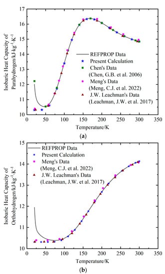 The ideal gas heat capacities of hydrogen are calculated and shown in Figure 8. The hydrogen pressure is set as 0.1 Mpa. The calculation results and REFPROP data are displayed in 1 K increments from 20 K to 300 K. Chen’s [], Meng’s [] and Leachman’s [] data are randomly extracted from their studies. Figure 8a shows that the calculated isobaric heat capacities (cp) of para-H2 agree well with all the data and deviate from the REFPROP data within 1% above 60 K. The calculated cp are consistent with Meng’s [] and Leachman’s [] data within 20–60 K, but deviate from REFPROP and Chen’s [] data below 60 K. The maximum deviation between the calculation and REFPROP data is 14.14% at 20 K. As shown in Figure 8b, the calculated cp of ortho-H2 is in good accordance with Meng’s [] and Leachman’s [] data. The deviation between the present calculation and REFPROP data is within 1% above 80 K and within 5% above 27 K, but the deviation becomes larger when temperature approaches the normal boiling point. This is because the REEPROP data in Figure 8 are the real gas isobaric heat capacities, but the calculated data are the ideal gas isobaric heat capacities. Para-H2 and ortho-H2 cannot be regarded as ideal gases near their normal boiling points. The difference between the real gas and the ideal gas heat capacities becomes larger at lower temperatures. Consequently, there is a deviation between the calculated isobaric heat capacities and the REEPROP data.