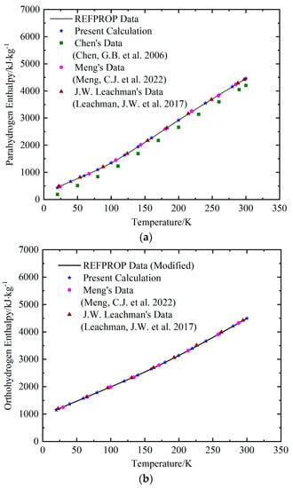 Enthalpy versus temperature: (a) para-H2; (b) ortho-H2 [,,].