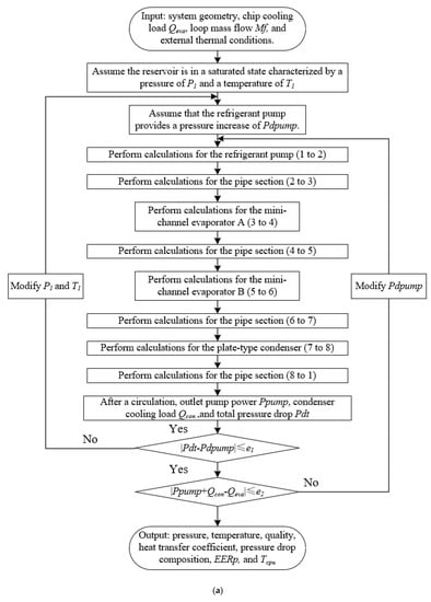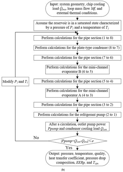 Figure 5 presents detailed flowcharts for solving the PCTCS. The reservoir’s saturated state of the refrigerant is established as the solving starting point. As depicted in Figure 5, two solution strategies are presented: the sequential solution and the reverse sequence solution. Figure 5a shows that the sequential solution follows the same order as the refrigerant flow, whereas the reverse sequence solution, depicted in Figure 5b, proceeds in the order opposite to the refrigerant flow. Both strategies are capable of rendering precise results. However, the sequential solution requires an initial assumption regarding the reservoir’s saturated refrigerant state and the PCTCS’s total pressure drop, thereby necessitating two coupled iterative cycles, while the reverse sequence solution only requires an initial assumption about the reservoir’s refrigerant state, demanding just a single iterative cycle. Moreover, in the condenser, the refrigerant and cooling water undergo countercurrent heat exchange. Adopting the reverse sequence solution can simplify the resolution process of the condenser without necessitating any iterations. Thus, this paper opts for the reverse sequence solution for its potential to reduce computational time.