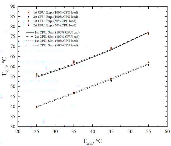 - The results from our simulations suggest that the PCTCS can efficiently manage CPU power as high as 80 W, attaining an EERp of up to 115, while ensuring that the temperatures of the two CPUs remain at 78.72 °C and 79.50 °C—within the CPUs’ thermal tolerance limits—when the inlet cooling water temperature is 45 °C;