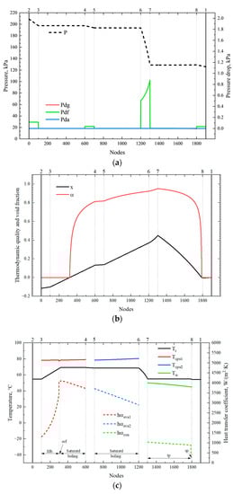 Internal parameter distribution in the PCTCS with default configuration: (a) pressure and pressure drop distribution; (b) thermodynamic quality and void fraction distribution; (c) temperature and heat transfer coefficient distribution.
