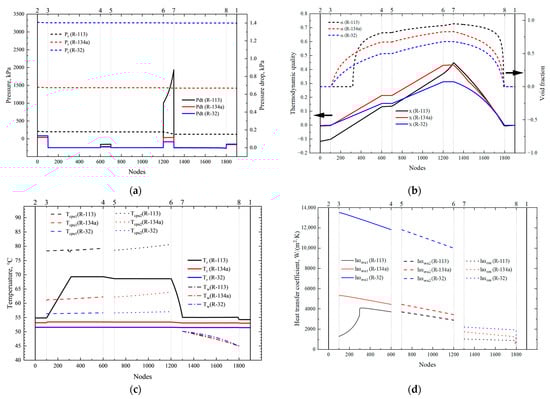 Internal parameter distribution in the PCTCS using different refrigerants (R-113, R-134a, and R-32): (a) pressure and total pressure drop distribution; (b) thermodynamic quality and void fraction distribution; (c) temperature distribution; (d) heat transfer coefficient distribution.