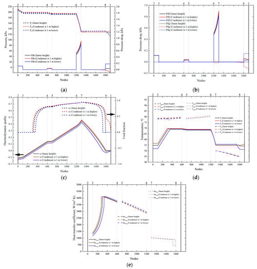 Internal parameter distribution of the PCTCS with different condenser heights: (a) pressure and total pressure drop distribution; (b) frictional and gravity pressure drop distribution; (c) thermodynamic quality and void fraction distribution; (d) temperature distribution; (e) heat transfer coefficient distribution.