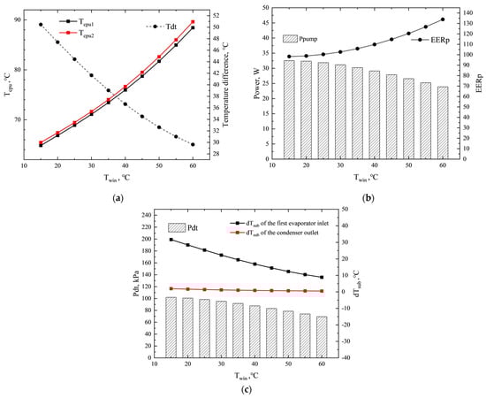 Figure 11 presents the performance of the PCTCS under varying Twin. As depicted in Figure 11a, when Twin increased from 15 °C to 60 °C, the average temperature of the two CPUs rose from 61.46 °C to 89.03 °C. Simultaneously, the Tdt of the PCTCS decreased from 56.74 °C to 29.63 °C, suggesting that a higher Twin can enhance the PCTCS’s temperature performance. In Figure 11b, as Twin escalated from 5 °C to 60 °C, Ppump in the PCTCS fell from 32.5 W to 23.9 W, while EERp improved from 98 to 134. This trend signifies that a greater Twin value improves the PCTCS’s energy efficiency. As shown in Figure 11c, as the Twin increased, the PCTCS’s Pdt and dTsub diminished, and a significant reduction in dTsub at the first mini-channel evaporator inlet was observed, dropping from 37.72 °C at a Twin of 5 °C to 8.86 °C at 60 °C. In summary, an increase in Twin significantly enhances both the temperature performance and energy efficiency of the PCTCS. Therefore, it is recommended to maximize the Twin during the operation of the PCTCS, provided the Tcpu does not surpass the threshold. This recommendation is in alignment with the conclusions drawn from several notable studies, including those conducted by Ma [48] and Ong [49]. Importantly, a higher Twin is favorable for natural cooling and waste heat recovery.
